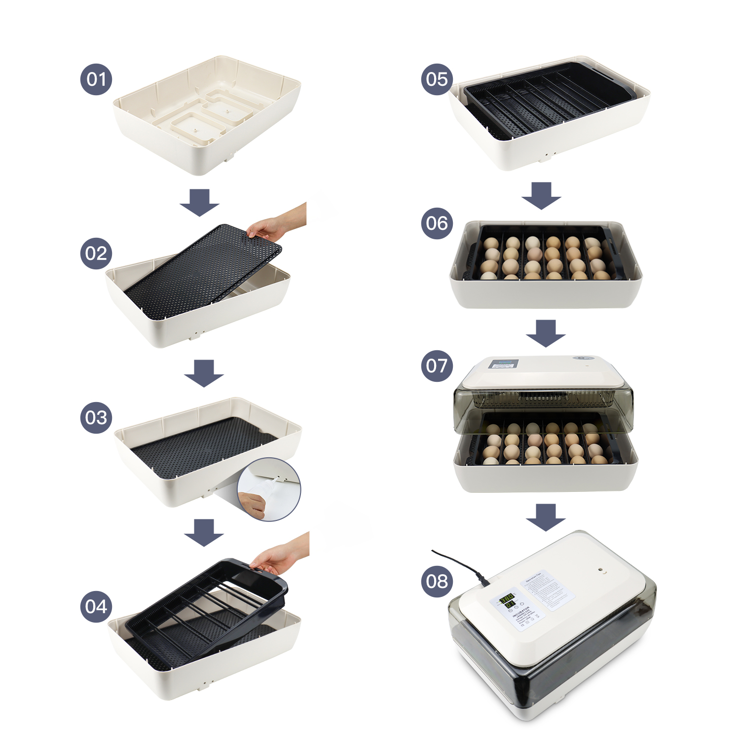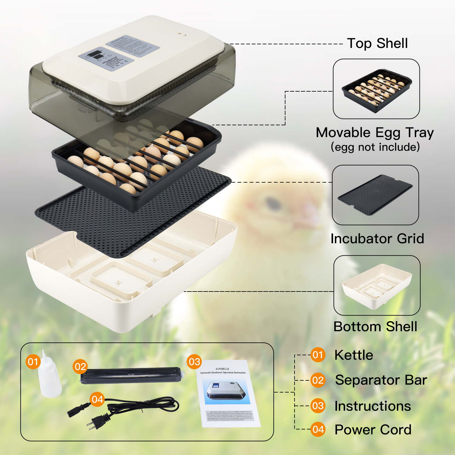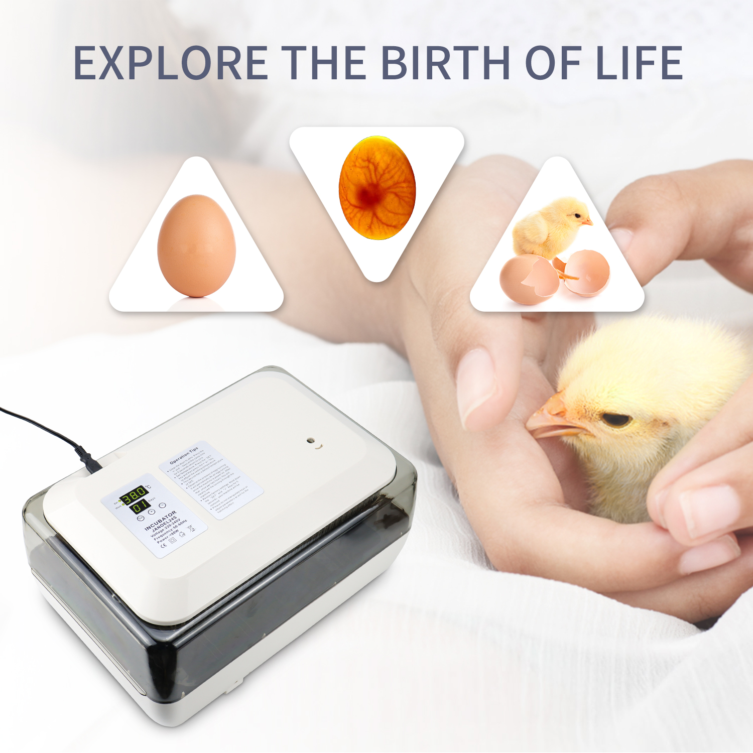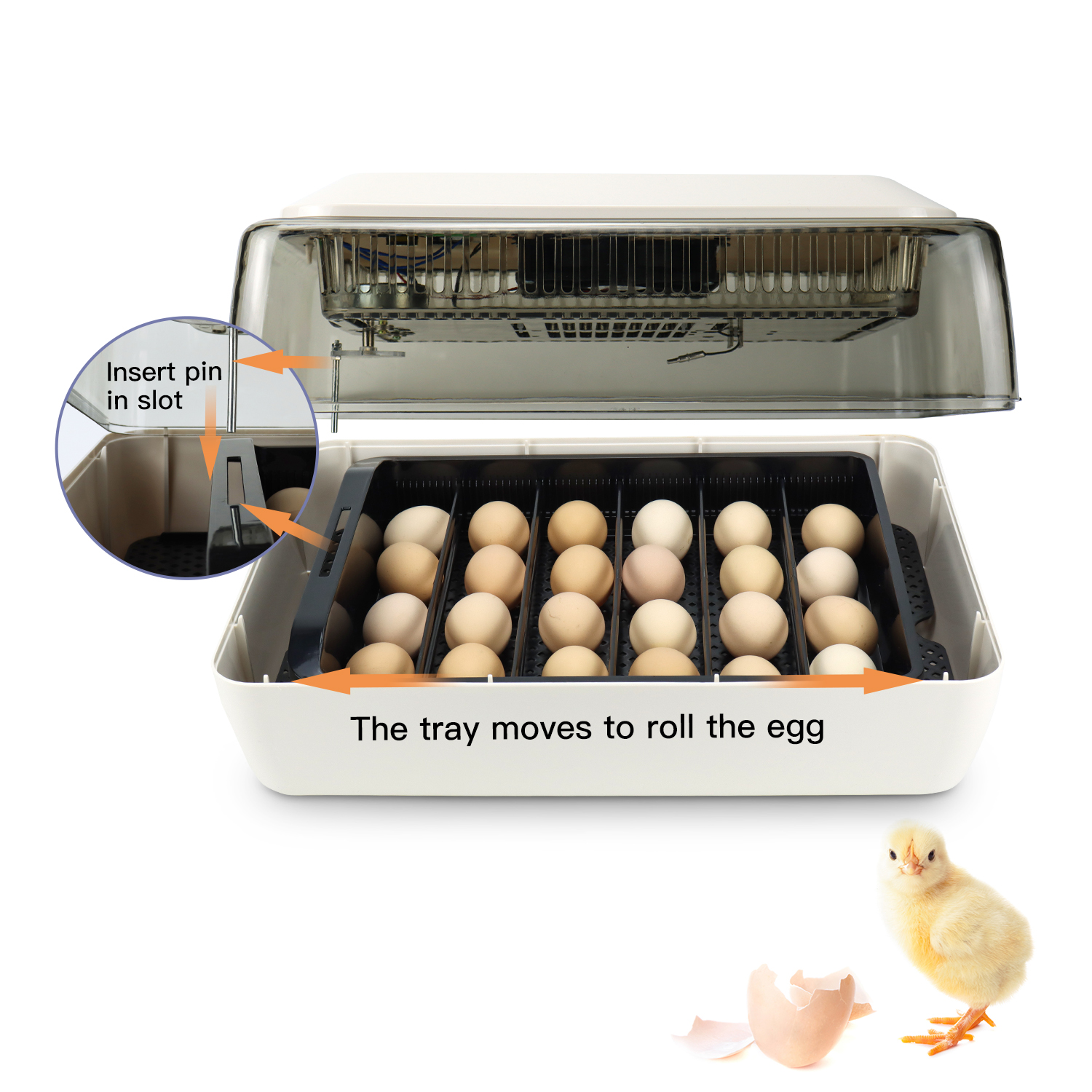 Introducing our professional-grade incubator, the perfect solution for all your hatching needs. Designed with precision and efficiency in mind, our incubator can accommodate up to 24 eggs, making it suitable for various types of eggs including quail, chicken, and duck eggs.