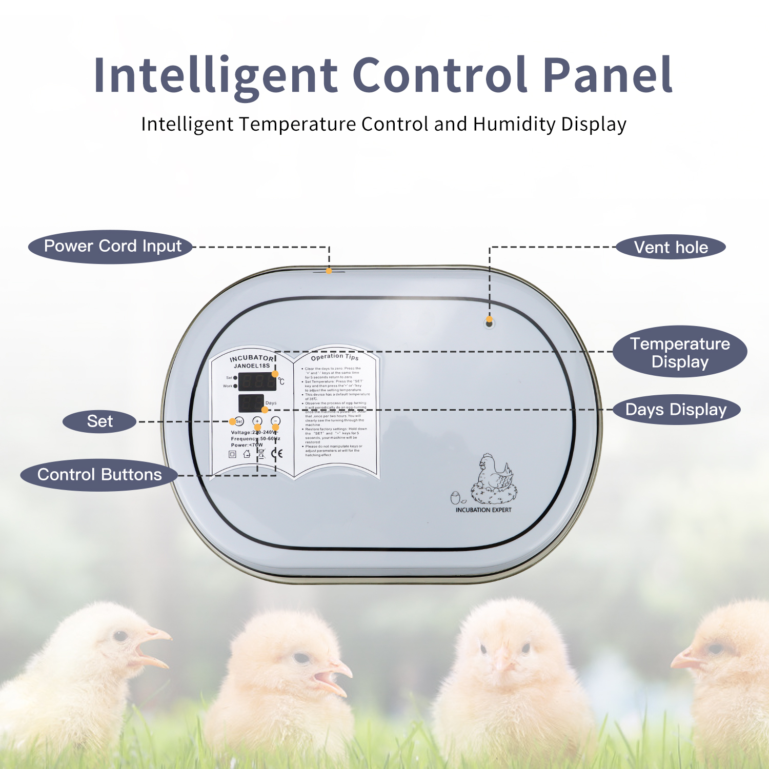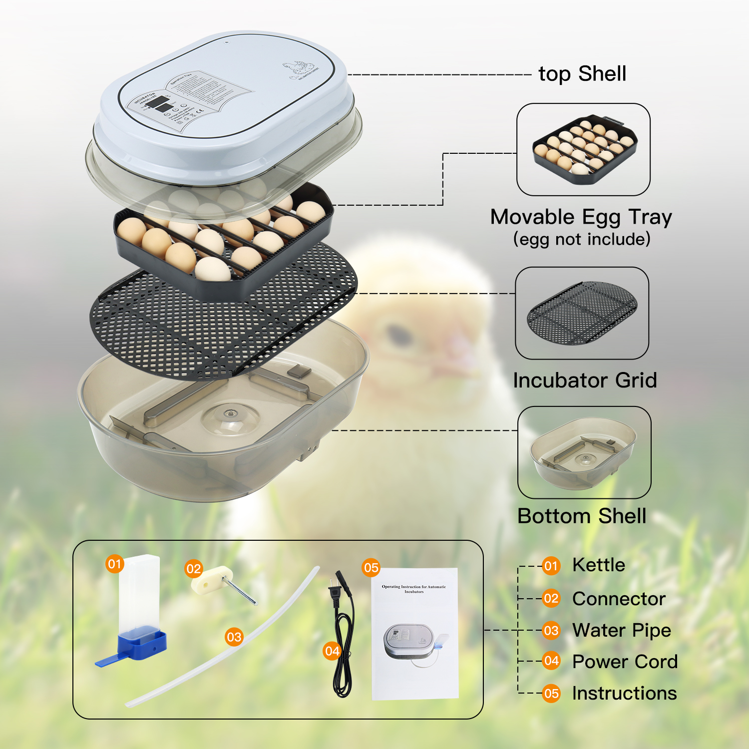 With a capacity to hold up to 18 eggs, our incubator boasts a versatile design with movable partitions. This allows you to adjust the partition positions based on the size of different eggs, accommodating quail, chicken, and duck eggs effortlessly.